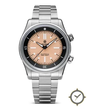 Eine Taucheruhr-Uhr mit einem markanten 42.5mm Auftritt am Handgelenk, gefertigt aus Edelstahl mit einem Zifferblatt in orange und einer besonderen "matte"-Oberfläche.