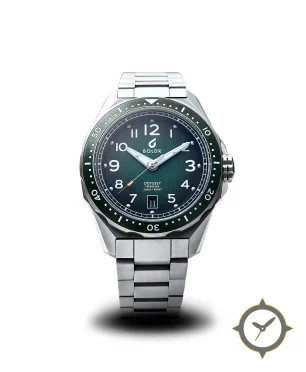 Eine Taucheruhr-Uhr mit einem 34mm Gehäuse im Vintage-Stil gefertigt aus Edelstahl mit einem Zifferblatt in grün und einer besonderen "sunburst with slight grain"-Oberfläche.