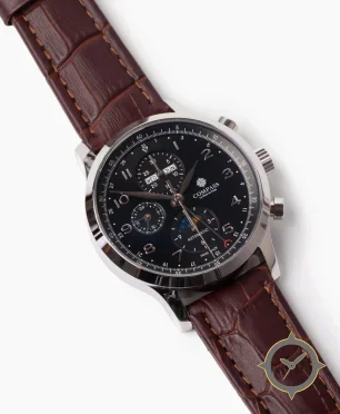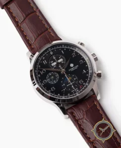 Eine Chronograph-Uhr mit einem markanten 43.5mm Auftritt am Handgelenk, gefertigt aus Edelstahl mit einem Zifferblatt in schwarz und einer besonderen "glossy lacquer with subtle sunburst"-Oberfläche und einer wunderschönen Mondphasenanzeige.