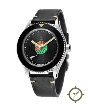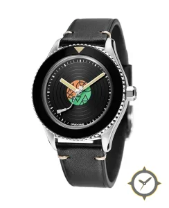 Eine Taucheruhr-Uhr mit einem markanten 46.5mm Auftritt am Handgelenk, gefertigt aus Edelstahl mit einem Zifferblatt in schwarz und einer besonderen "concentric rings"-Oberfläche.