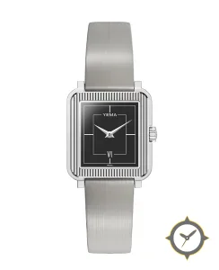 Eine Dress-Uhr mit einem 19.5mm Gehäuse im Vintage-Stil gefertigt aus Edelstahl mit einem Zifferblatt in schwarz und einer besonderen "glossy lacquer"-Oberfläche.