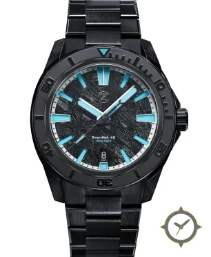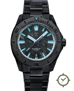 Eine Taucheruhr-Uhr mit einem markanten 46.5mm Auftritt am Handgelenk, gefertigt aus Edelstahl mit einem Zifferblatt in schwarz und einer besonderen "meteorite-like etched texture with radial/crosshatch striations"-Oberfläche.
