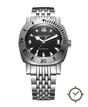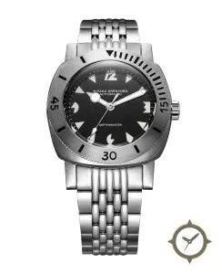 Eine Taucheruhr-Uhr mit einem 36.5mm Gehäuse im Vintage-Stil gefertigt aus Edelstahl mit einem Zifferblatt in schwarz und einer besonderen "matte"-Oberfläche.