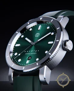 Eine Taucheruhr-Uhr mit einem 34mm Gehäuse im Vintage-Stil gefertigt aus Edelstahl mit einem Zifferblatt in grün und einer besonderen "radial sunburst"-Oberfläche.