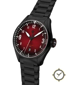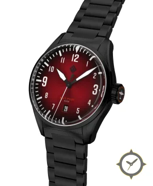 Eine Pilot-Uhr mit einem 33.5mm Gehäuse im Vintage-Stil gefertigt aus Edelstahl mit einem Zifferblatt in rot und einer besonderen "sunburst"-Oberfläche.