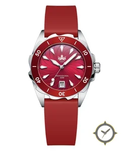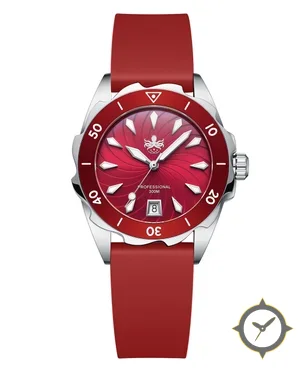 Eine Taucheruhr-Uhr mit einem 31.5mm Gehäuse im Vintage-Stil gefertigt aus Edelstahl mit einem Zifferblatt in rot und einer besonderen "spiral sunburst"-Oberfläche.