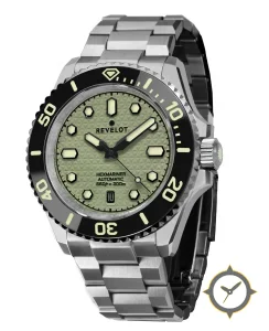 Eine Taucheruhr-Uhr mit einem markanten 44.5mm Auftritt am Handgelenk, gefertigt aus Edelstahl mit einem Zifferblatt in grün und einer besonderen "triangular waffle texture"-Oberfläche.