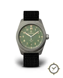Eine Field-Uhr mit einem markanten 46.5mm Auftritt am Handgelenk, gefertigt aus Titan mit einem Zifferblatt in grün und einer besonderen "matte"-Oberfläche.