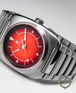 Eine Sport-Uhr mit einem vielseitigen 38mm Gehäuse, das an fast jedes Handgelenk passt, gefertigt aus Edelstahl mit einem Zifferblatt in rot und einer besonderen "sunburst gradient"-Oberfläche.