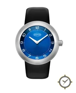 Eine Minimalistisch-Uhr mit einem 35.5mm Gehäuse im Vintage-Stil gefertigt aus Edelstahl mit einem Zifferblatt in blau und einer besonderen "sunburst"-Oberfläche.