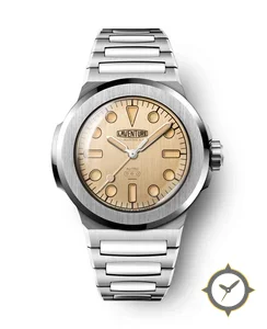 Eine Sport-Uhr mit einem markanten 43mm Auftritt am Handgelenk, gefertigt aus Edelstahl mit einem Zifferblatt in gold und einer besonderen "brushed (vertical)"-Oberfläche.