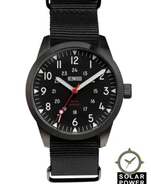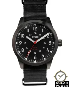 Eine Field-Uhr mit einem markanten 44.5mm Auftritt am Handgelenk, gefertigt aus Edelstahl mit einem Zifferblatt in schwarz und einer besonderen "matte"-Oberfläche.