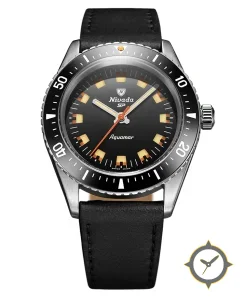 Eine Taucheruhr-Uhr mit einem 36.5mm Gehäuse im Vintage-Stil gefertigt aus Edelstahl mit einem Zifferblatt in schwarz und einer besonderen "matte"-Oberfläche.