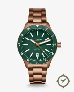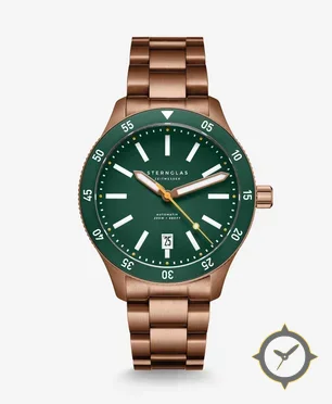 Eine Taucheruhr-Uhr mit einem markanten 42.5mm Auftritt am Handgelenk, gefertigt aus Bronze mit einem Zifferblatt in grün und einer besonderen "matte"-Oberfläche.