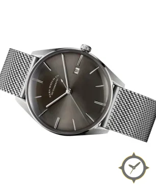 Eine Minimalistisch-Uhr mit einem 36mm Gehäuse im Vintage-Stil gefertigt aus Edelstahl mit einem Zifferblatt in grau und einer besonderen "sunburst"-Oberfläche.