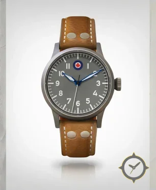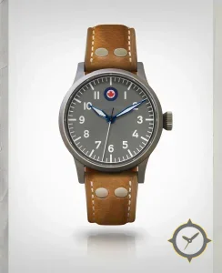 Eine Pilot-Uhr mit einem 35.5mm Gehäuse im Vintage-Stil gefertigt aus Edelstahl mit einem Zifferblatt in grau und einer besonderen "matte"-Oberfläche.