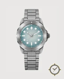 Eine Taucheruhr-Uhr mit einem 32mm Gehäuse im Vintage-Stil gefertigt aus Edelstahl mit einem Zifferblatt in türkis und einer besonderen "sunburst gradient"-Oberfläche.