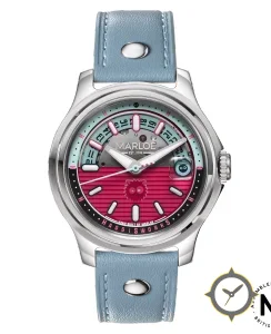 Eine Skelett-Uhr mit einem 32mm Gehäuse im Vintage-Stil gefertigt aus Edelstahl mit einem Zifferblatt in karmesinrot und einer besonderen "striped"-Oberfläche.