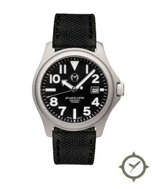 Eine Field-Uhr mit einem 34.5mm Gehäuse im Vintage-Stil gefertigt aus Titan mit einem Zifferblatt in schwarz und einer besonderen "matte"-Oberfläche.