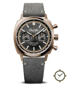 Eine Chronograph-Uhr mit einem 33.5mm Gehäuse im Vintage-Stil gefertigt aus Gold mit einem Zifferblatt in grau und einer besonderen "sunburst/metallic"-Oberfläche.