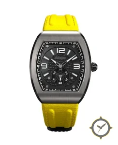 Eine Sport-Uhr gefertigt aus Edelstahl mit einem Zifferblatt in schwarz und einer besonderen "carbon-fiber weave"-Oberfläche.