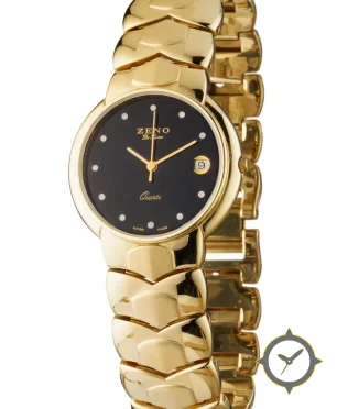 Eine Dress-Uhr gefertigt aus Gold mit einem Zifferblatt in schwarz und einer besonderen "matte"-Oberfläche.
