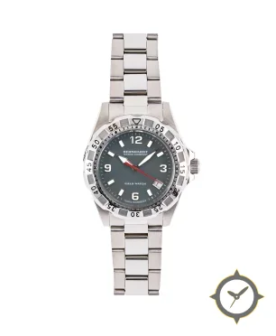 Eine Field-Uhr mit einem 35.5mm Gehäuse im Vintage-Stil gefertigt aus Edelstahl mit einem Zifferblatt in grau und einer besonderen "matte"-Oberfläche.