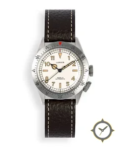 Eine Pilot-Uhr mit einem 33mm Gehäuse im Vintage-Stil gefertigt aus Edelstahl mit einem Zifferblatt in weiß und einer besonderen "matte"-Oberfläche.