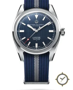 Eine Field-Uhr mit einem 34mm Gehäuse im Vintage-Stil gefertigt aus Edelstahl mit einem Zifferblatt in blau und einer besonderen "vertical brushing/finishing"-Oberfläche.