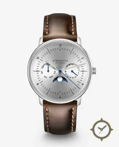 Eine Dress-Uhr mit einem vielseitigen 41mm Gehäuse, das an fast jedes Handgelenk passt, gefertigt aus Edelstahl mit einem Zifferblatt in silber und einer besonderen "brushed sunburst"-Oberfläche und einer wunderschönen Mondphasenanzeige.