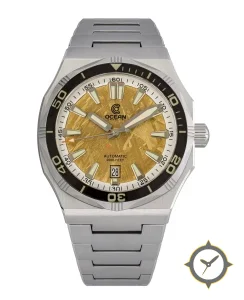 Eine Taucheruhr-Uhr mit einem 37mm Gehäuse im Vintage-Stil gefertigt aus Edelstahl mit einem Zifferblatt in gold und einer besonderen "meteorite-style textured (hammered/striated)"-Oberfläche.