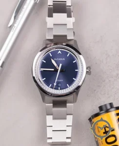 Eine Sport-Uhr mit einem markanten 41.5mm Auftritt am Handgelenk, gefertigt aus Edelstahl mit einem Zifferblatt in blau und einer besonderen "sunburst"-Oberfläche.