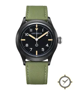 Eine Pilot-Uhr mit einem 32.5mm Gehäuse im Vintage-Stil gefertigt aus Beschichtung mit einem Zifferblatt in schwarz und einer besonderen "matte"-Oberfläche.