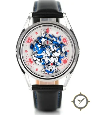 Eine Minimalistisch-Uhr mit einem 35mm Gehäuse im Vintage-Stil gefertigt aus Edelstahl mit einem Zifferblatt in weiß und einer besonderen "printed illustration"-Oberfläche.