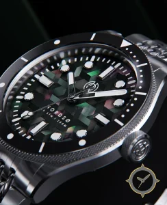 Eine Taucheruhr-Uhr mit einem 36.5mm Gehäuse im Vintage-Stil gefertigt aus Edelstahl mit einem Zifferblatt in schwarz und einer besonderen "iridescent mother-of-pearl mosaic (geometric)"-Oberfläche.