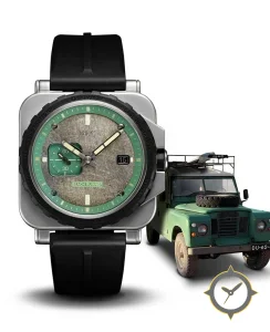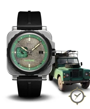 Eine Tool-Uhr mit einem markanten 44.5mm Auftritt am Handgelenk, gefertigt aus Edelstahl mit einem Zifferblatt in grün und einer besonderen "distressed/grained metal center with smooth outer chapter ring"-Oberfläche.