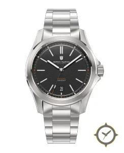 Eine Sport-Uhr mit einem 34.5mm Gehäuse im Vintage-Stil gefertigt aus Edelstahl mit einem Zifferblatt in schwarz und einer besonderen "grainy / sandblasted"-Oberfläche.
