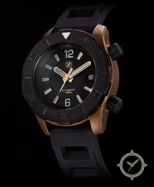 Eine Taucheruhr-Uhr mit einem markanten 49mm Auftritt am Handgelenk, gefertigt aus Bronze mit einem Zifferblatt in schwarz und einer besonderen "matte"-Oberfläche.