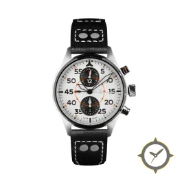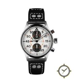 Eine Pilot-Uhr mit einem markanten 41.5mm Auftritt am Handgelenk, gefertigt aus Edelstahl mit einem Zifferblatt in weiß und einer besonderen "matte"-Oberfläche.