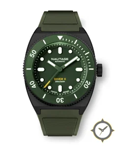 Eine Taucheruhr-Uhr mit einem 36.5mm Gehäuse im Vintage-Stil gefertigt aus Edelstahl mit einem Zifferblatt in grün und einer besonderen "matte"-Oberfläche.