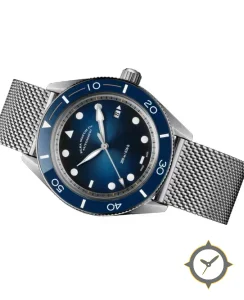 Eine Taucheruhr-Uhr mit einem markanten 45mm Auftritt am Handgelenk, gefertigt aus Edelstahl mit einem Zifferblatt in blau und einer besonderen "sunburst"-Oberfläche.