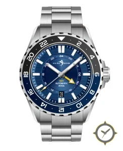 Eine GMT-Uhr mit einem markanten 42.5mm Auftritt am Handgelenk, gefertigt aus Edelstahl mit einem Zifferblatt in blau und einer besonderen "textured with horizontal brushing"-Oberfläche und einer echten GMT-Funktion, mit der du eine zweite Zeitzone verfolgen kannst.