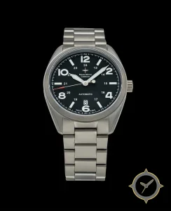 Eine Field-Uhr mit einem vielseitigen 39mm Gehäuse, das an fast jedes Handgelenk passt, gefertigt aus Edelstahl mit einem Zifferblatt in schwarz und einer besonderen "matte"-Oberfläche.