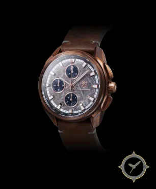 Eine Chronograph-Uhr mit einem vielseitigen 41mm Gehäuse, das an fast jedes Handgelenk passt, gefertigt aus Bronze mit einem Zifferblatt in grau und einer besonderen "meteorite/stone texture (textured)"-Oberfläche.
