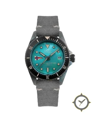 Eine Taucheruhr-Uhr mit einem markanten 44mm Auftritt am Handgelenk, gefertigt aus Edelstahl mit einem Zifferblatt in türkis und einer besonderen "patinated / marbled finish"-Oberfläche.