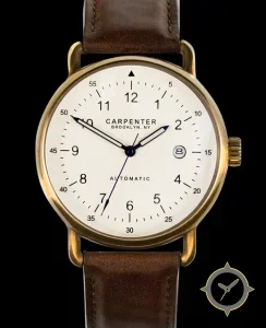 Eine Minimalistisch-Uhr mit einem 34mm Gehäuse im Vintage-Stil gefertigt aus Bronze mit einem Zifferblatt in weiß und einer besonderen "matte"-Oberfläche.