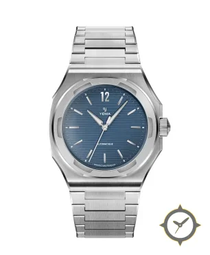 Eine Luxus-Uhr mit einem markanten 42mm Auftritt am Handgelenk, gefertigt aus Edelstahl mit einem Zifferblatt in blau und einer besonderen "brushed with horizontal 'teak'-style grooves"-Oberfläche.