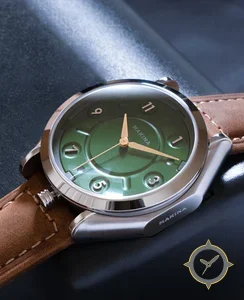 Eine Dress-Uhr mit einem vielseitigen 40mm Gehäuse, das an fast jedes Handgelenk passt, gefertigt aus Edelstahl mit einem Zifferblatt in grün und einer besonderen "sunburst with subtle concentric rings"-Oberfläche.