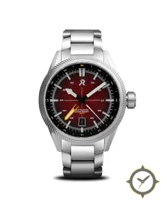Eine GMT-Uhr mit einem vielseitigen 39.5mm Gehäuse, das an fast jedes Handgelenk passt, gefertigt aus Edelstahl mit einem Zifferblatt in rot und einer besonderen "granular / speckled textured finish"-Oberfläche und einer echten GMT-Funktion, mit der du eine zweite Zeitzone verfolgen kannst.