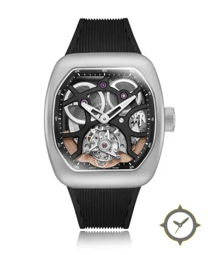 Eine Skelett-Uhr mit einem markanten 44.5mm Auftritt am Handgelenk, gefertigt aus Edelstahl mit einem Zifferblatt in schwarz und einer besonderen "open-work / skeleton with visible movement bridges and gears"-Oberfläche.